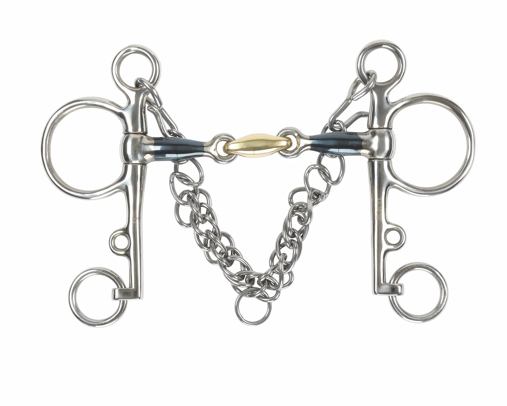 The Pelham is often used to help with control. The lozenge distributes pressure over both the tongue and bars of the mouth. Can be used with double reins or Pelham roundings. Mouthpiece thickness: 14mm. Cheek height: 125mm (4.5"), 130mm (5"), 140mm (5.5", 6"). Blue sweet iron mouthpieces oxidise easily to create warmth with a sweet taste which helps with bit acceptance and encourages salivation. Please note the blue colour will fade with use. Stainless steel is used for the cheeks due to it being durable, easy to clean and resistance to rust.