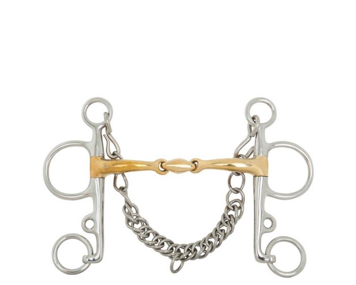This high-quality double jointed Pelham bit, with loose shanks and leverage, is made of solid Cupharnessan with stainless steel rings. Cupharnessan is an alloy consisting of 89% copper, 7% aluminum, 3% iron and 1% zinc. The oxidation process of the material gives a pleasant smell and taste. The anatomical design follows the shape of the horse's mouth, creating a soft and even pressure distribution. Due to the combination of the design and the unique composition of Cupharnessan, the chewing process and the saliva formatteion are stimulated, so that a fine connection can be created with the sensitive horse's mouth. The upward scissors with ring are slightly outwards, which ensures optimal freedom for the horse's head. The bit has a sharp effect on the mouth. The mouthpiece has a thickness of 16 mm and the scissors have a length of 145 mm. Including curb chain.