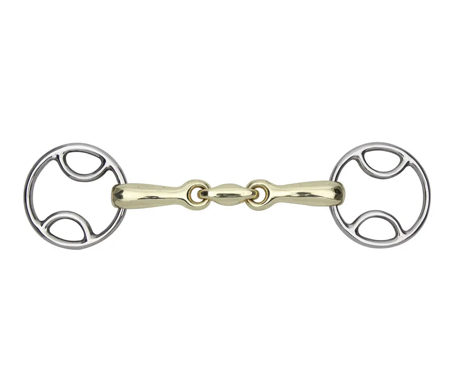 The bevel bit allows mild leverage, with a brass alloy lozenge to assist with salivation. The ring is larger on the 5 and 5.5 so the bit remains in proportion with the larger horse's head. Mouthpiece thickness: 16mm. Cheek height: 55mm (4.5, 5), 70mm (5.5). Brass alloy mouth: Copper is alloyed with a harder metal to produce warm, durable mouthpieces which aid salivation. Stainless steel is used for the cheeks due to it being durable, easy to clean and resistance to rust.