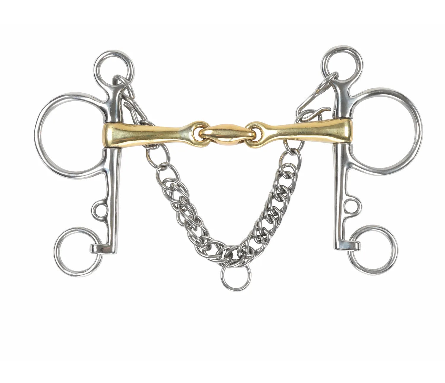 This bit is often used to help with control. The double joint with lozenge softens the nutcracker action and the brass alloy assists with salivation. Can be used with double reins or Pelham roundings. Mouthpiece thickness: 14mm. Cheek height: 115mm (4.5"), 130mm (5"), 140mm (5.5", 6"). Brass alloy mouth: Copper is alloyed with a harder metal to produce warm, durable mouthpieces which aid salivation. Stainless steel is used for the cheeks due to it being durable, easy to clean and resistance to rust.