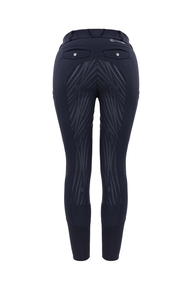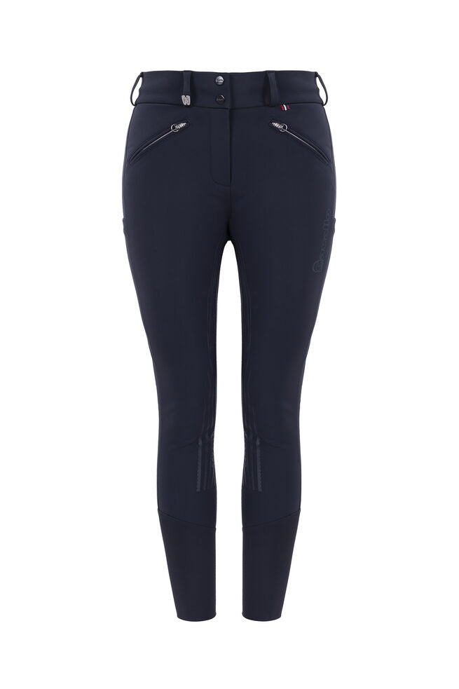 Sporty, comfortable breeches with a traditional look made from a comfortable material with soft brushed inside. Two zipped pockets at the front with decorative Cavallo jewelry handles. Two imitation flap pockets with Cavallo button at the back. Side mobile phone pockets blend in with the stitching on the thighs. Tonal Cavallo logo on the belt loop in the back centre and a fashionable, tonal Cavallo lettering on the thigh underline the traditional look.