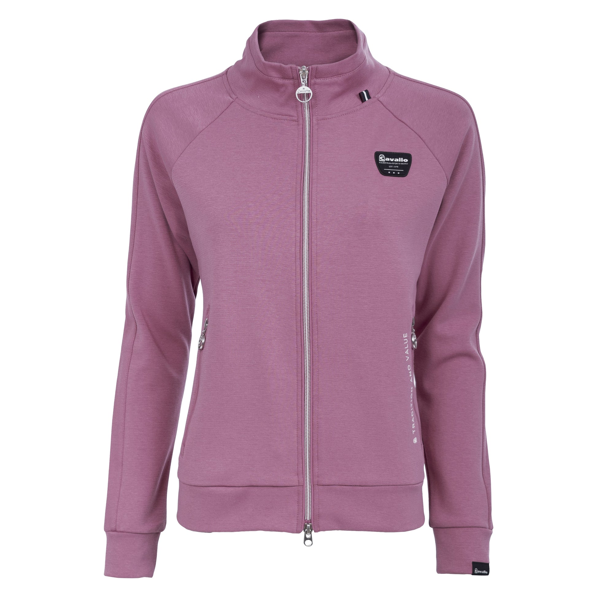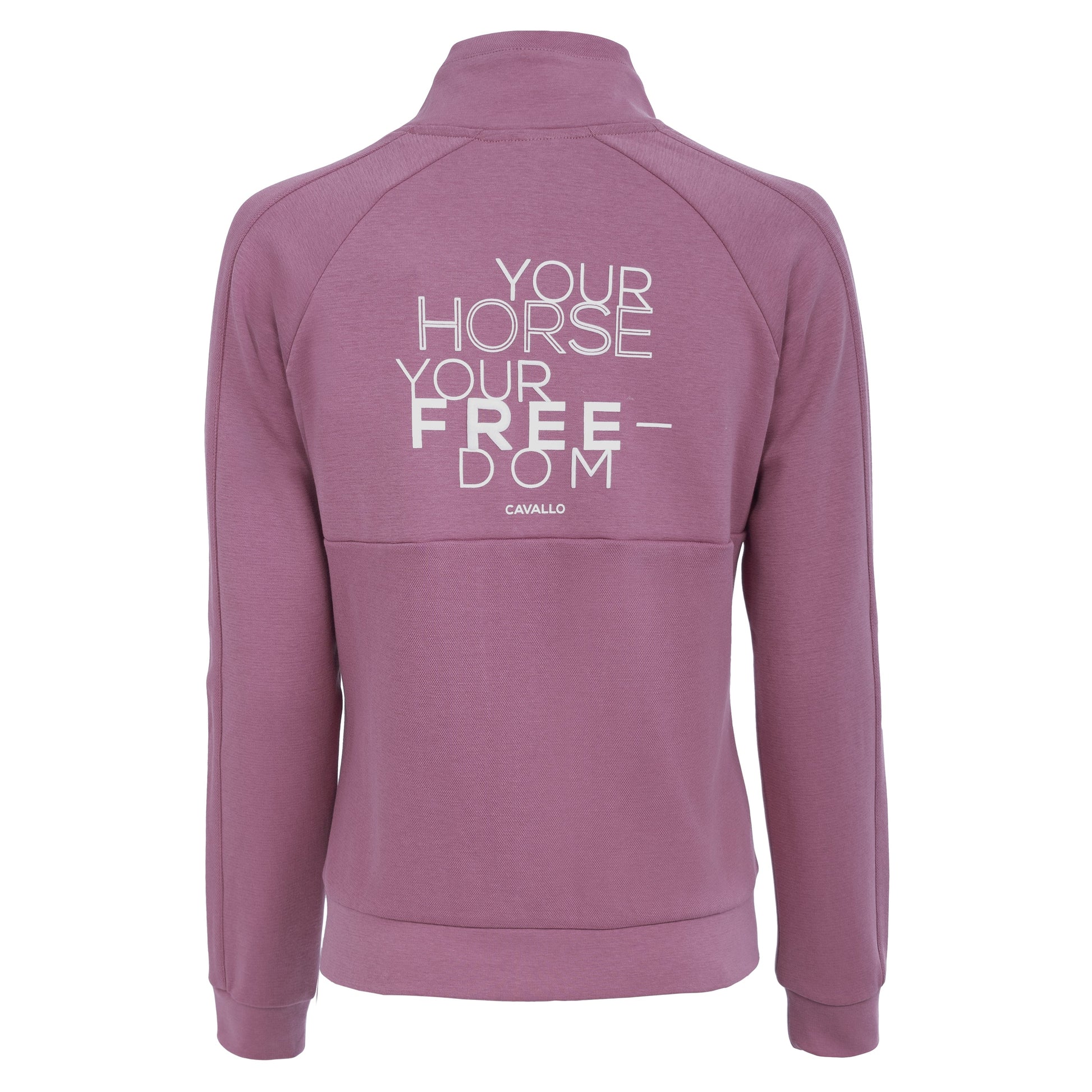 The Cavallo women's training jacket Deyna shows a Cavallo patch on the left chest. It has a special look, since the inside of the material was processed as the outside of parts of the jacket. The large Cavallo artwork shows on the back. It is equipped with two front pockets with zips and a 2-way zip on the front. All visible zippers are finished with jewelry handle and crystal.