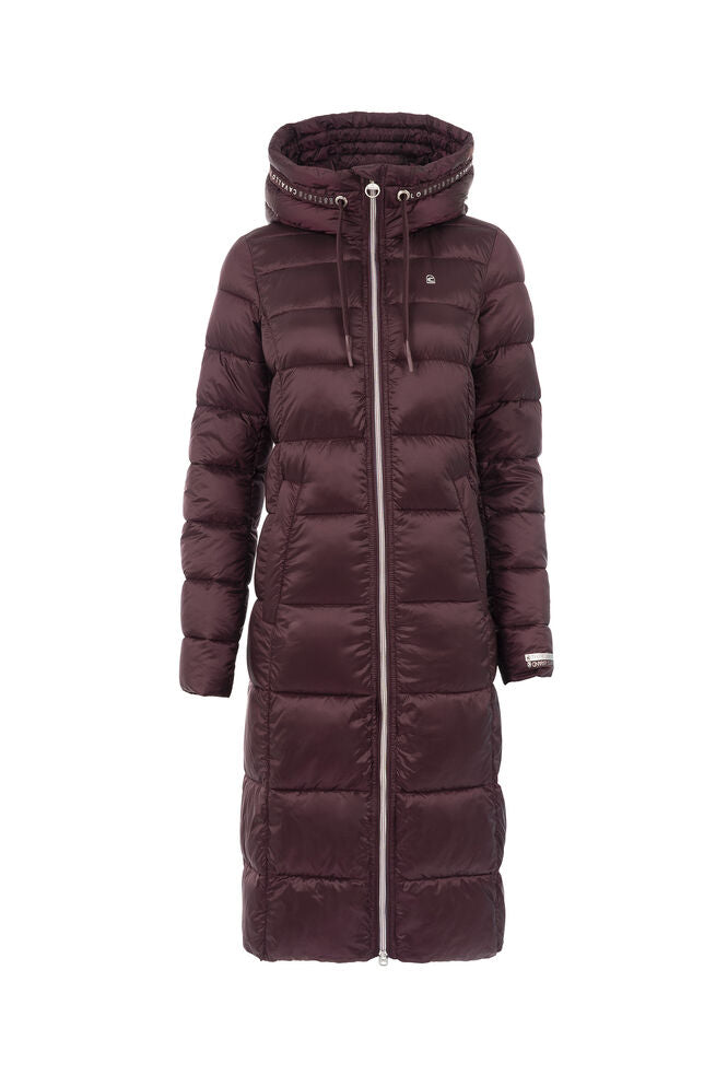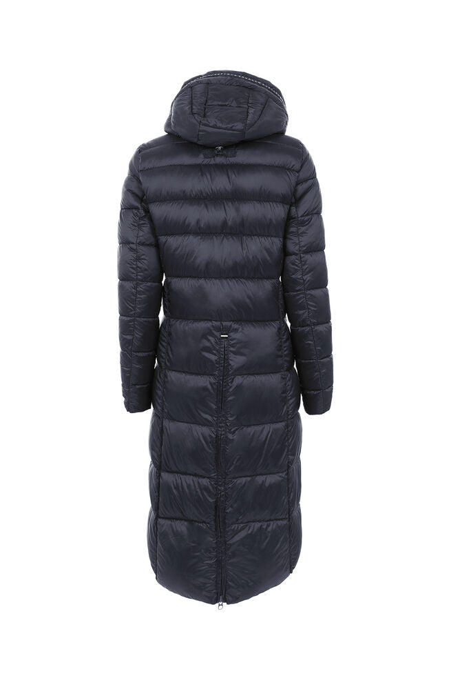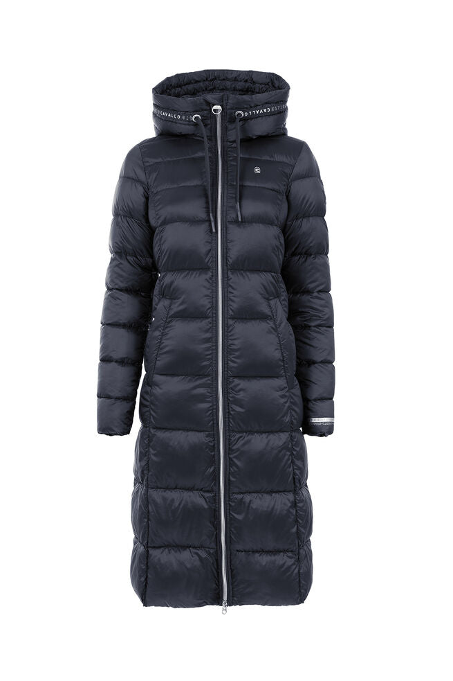 With cosy and warm fake down filling. Shimmering, iridescent outer material. Long zip in the back centre allows the coat to be worn while ridingl Two spacious front pockets with silver zips and jewelry pull with crystal. Long, silver 2-way front zip with Cavallo jewelry pull with decorative crystal. Printed Cavallo ribbon around the hood.