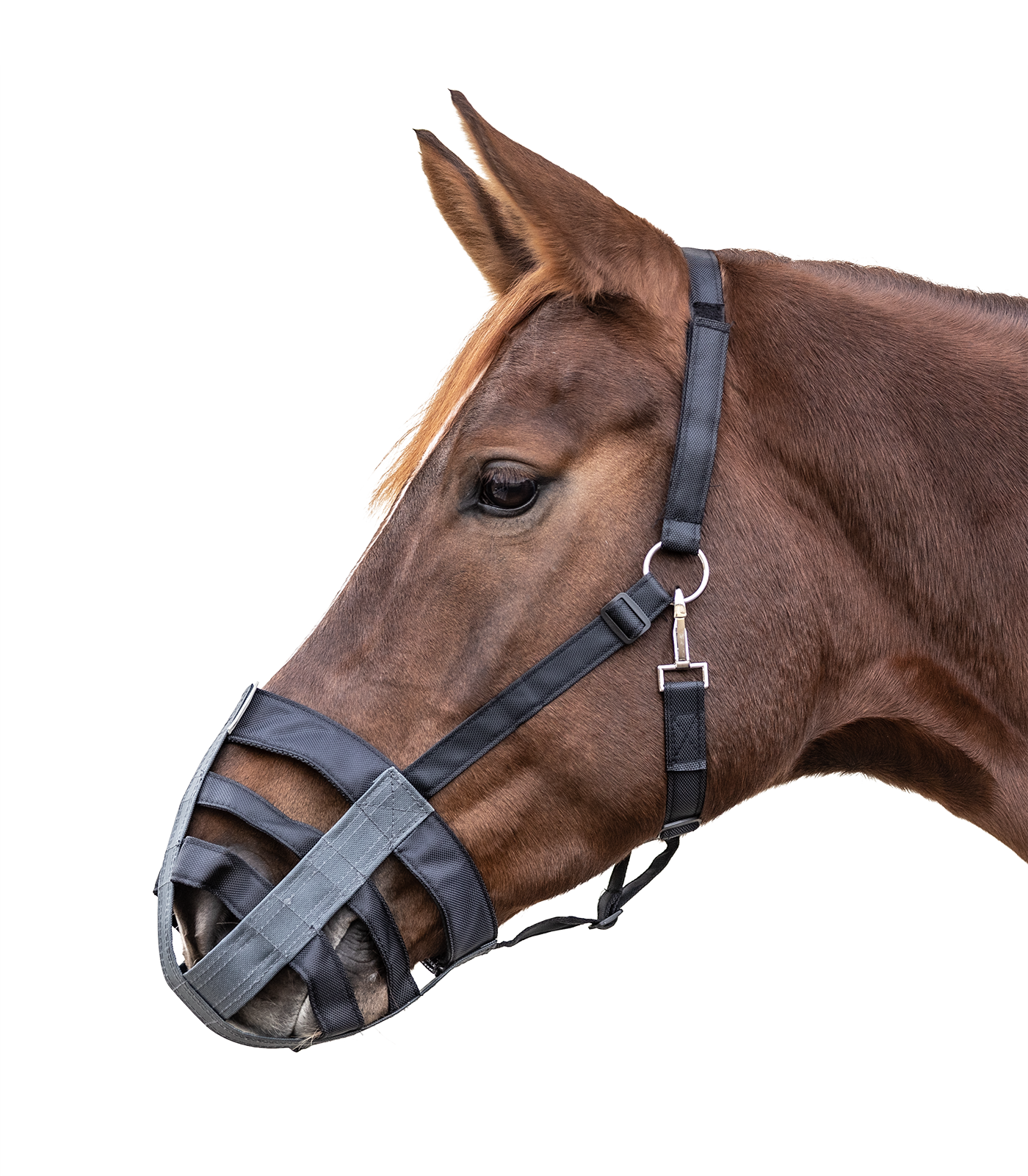 The TPU muzzle is a robust and easycare muzzle to reduce food intake, particularly whilst grazing. Halter with integrated secure fastener on the headpiece.