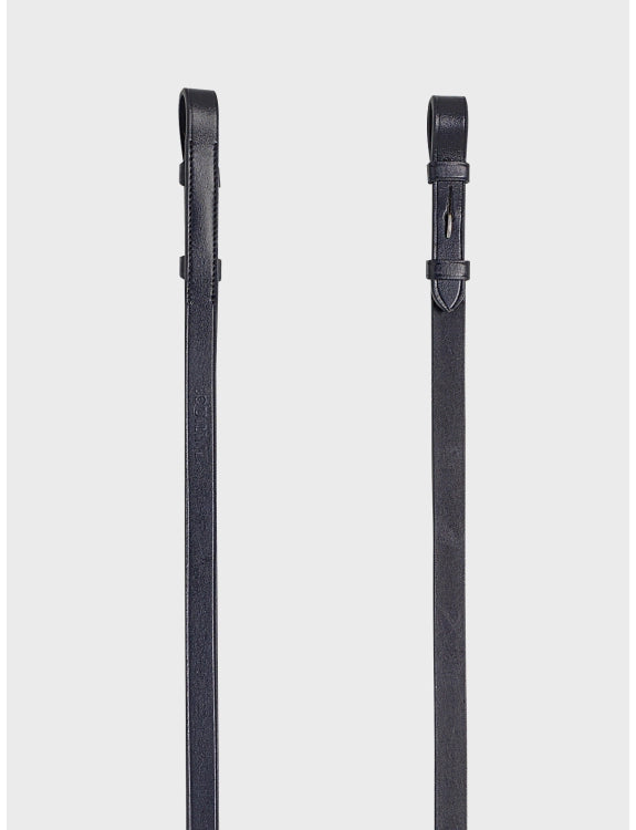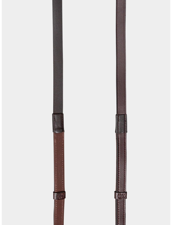 Continental leather reins with rubber internal part. 6 leather stops and hook & stud closure . Width 5/8” and length 58”. Available in black & brown.