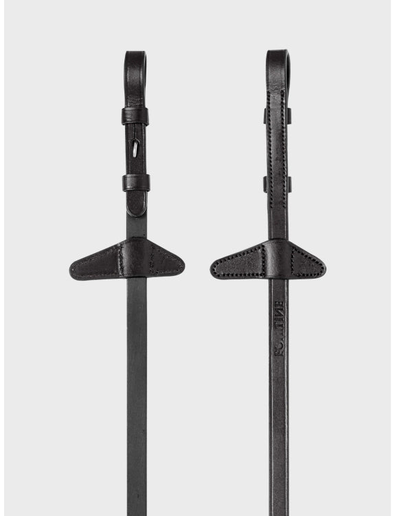 Leather with nylon inserted rubber grip reins with new shape martingale stopper and hook & stud closure . Width 5/8” and length 58”. Available in black & brown.