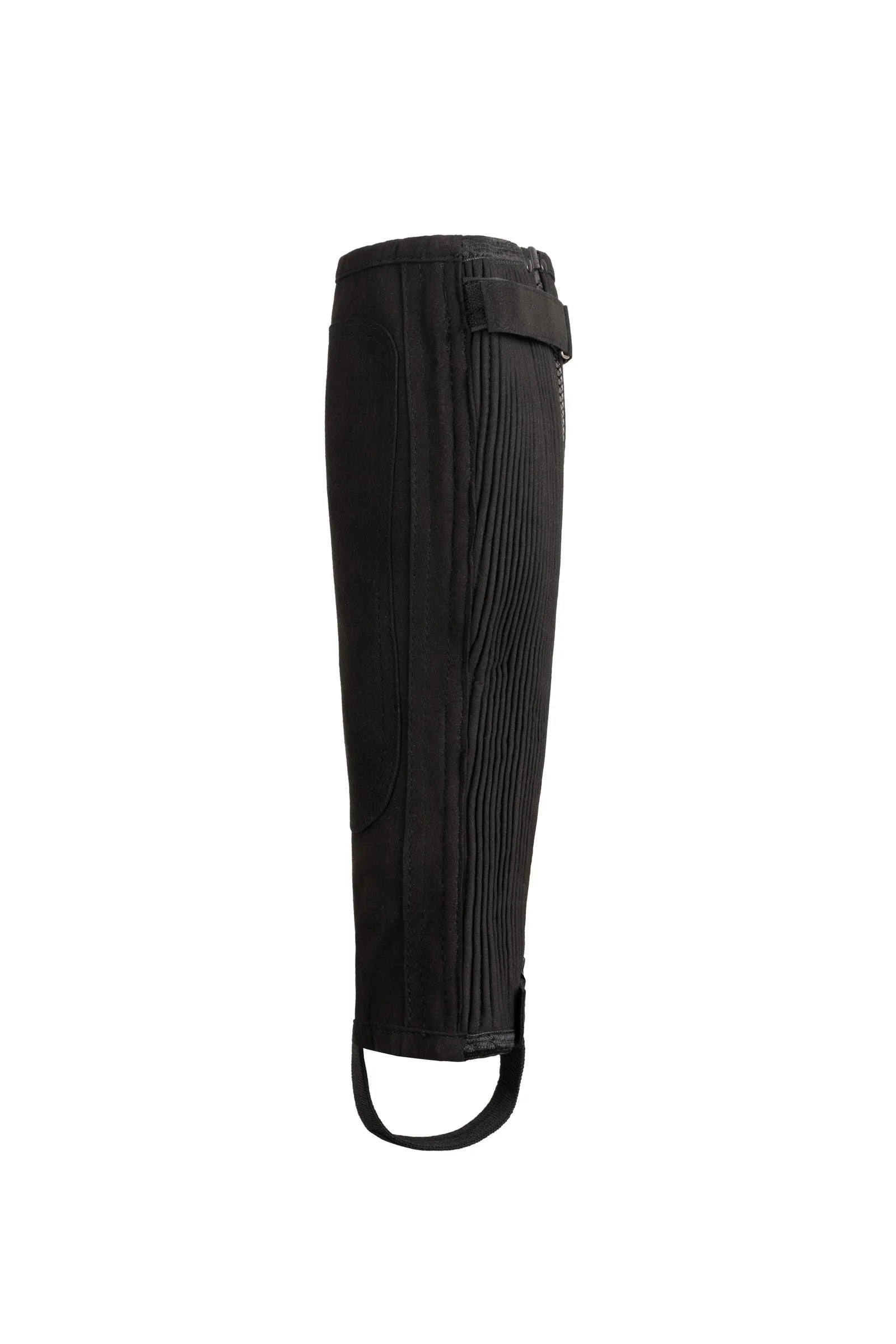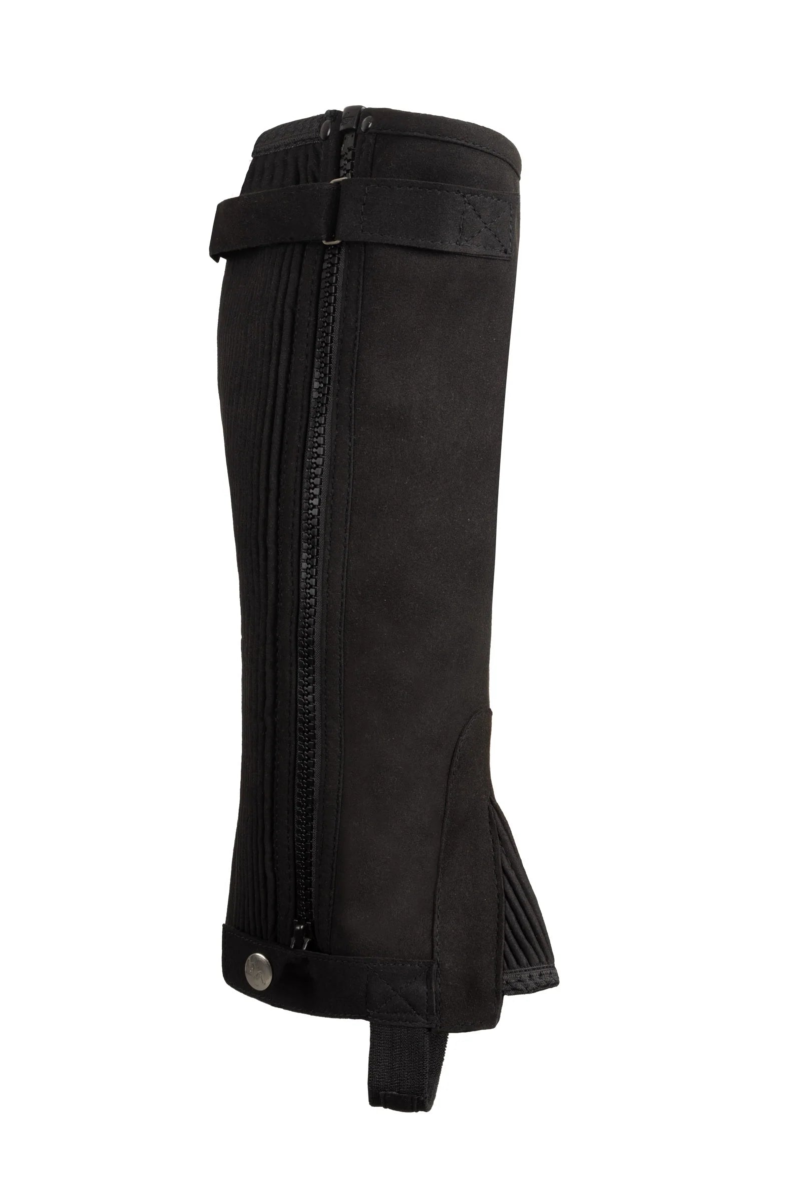 Horze pays special attention to detail when creating these half chaps for juniors to make certain the fabric used is high grade for dependability, longevity and comfort. The natural Amara leather-like product is similar in structure to natural leather but is completely synthetic. The microfiber suede texture is soft, durable and tear resistant with high tensile strength that maintains its shape and tackles rigorous use with ease. These half chaps form easily to the natural contour of the lower leg for a snug fit. A durable, full-length YKK zipper placed between the stretch panels keeps the position secure. The top features a hook-and-loop fasteners strap to adjust for a custom feel while a bottom strap overlaps the locked zipper for safety, snapping tightly in place. Keeping the rider's comfort in mind, inner panels prevent rubbing and provide superior grip even in wet conditions.