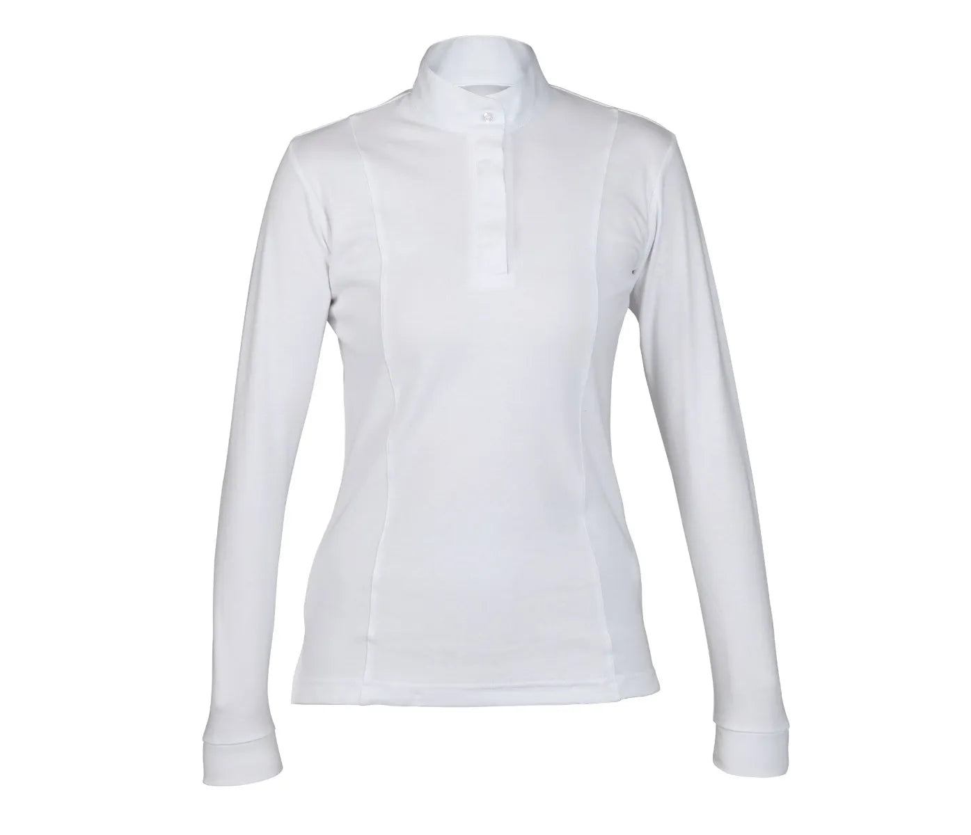 Knitted jersey cotton makes the Aubrion winter riding shirt a comfortable base for cool weather showing, winter riding or field sports. The panelled shirt has a relaxed shape, long sleeves are finished with jersey cuffs. The cotton stock collar looks smart, the hidden quick zip closure is finished with a top collar button. Further detail: soft cotton, breathable, stretch for free movement, comfort seams, signature ribbon patch, Aubrion neck tape, badge and prints.