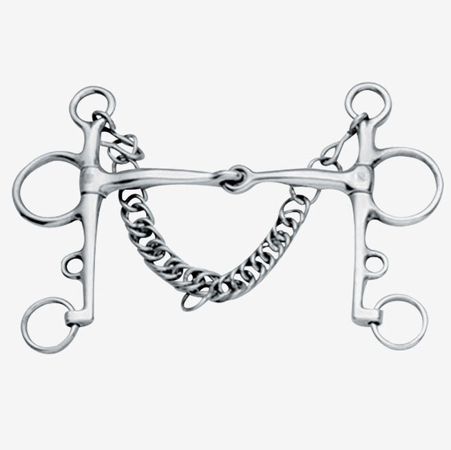 The setting of the curb-chain makes it possible to dose the strengh of the action of the Pelham- short shank.