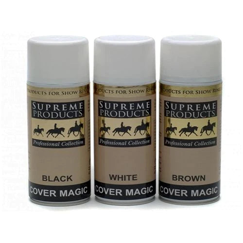 Supreme Products Cover Magic Black can be used to cover marks and scars and stray white or light coloured hairs. It can also be used to blacken or darken legs and add definition. Spray from a distance of approx. 10 inches through the tail to cover stains and brush with a soft brush to disperse