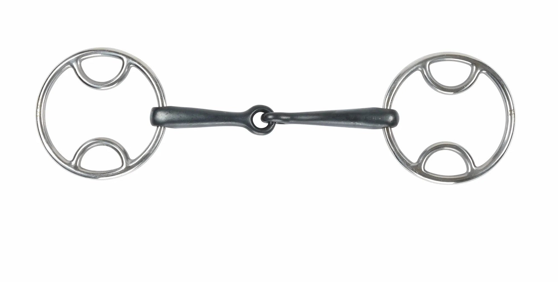 The jointed bevel bit allows mild leverage and offers a little more control, promoting outline, head carriage and responsiveness. The sweet iron encourages salivation. Mouthpiece thickness: 14mm. Cheek height: 55mm (4.5, 5), 70mm (5.5). Sweet iron mouthpieces are designed to oxidize to produce a sweet taste which helps with mouthing. Stainless steel is used for the cheeks due to it being durable, easy to clean and resistance to rust.