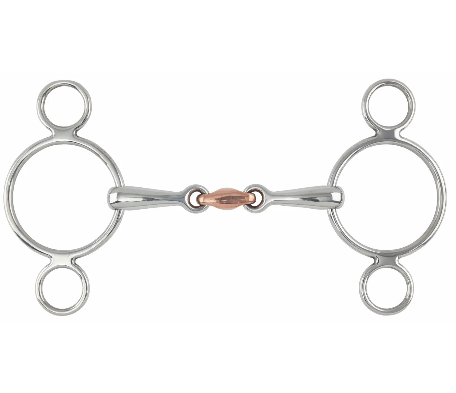 This bit allows the rein to be placed on either the main ring or smaller lower ring for more leverage whilst the copper lozenge encourages the horse to salivate. The 5" and smaller sizes of this bit have smaller rings to ensure the bit remains in proportion. Mouthpiece thickness: 16mm. Cheek height: 120mm (4.5", 5"), 145mm (5.5", 6"). Stainless steel is the most common material for bits. Durable, easy to clean, tasteless and does not rust. Copper is used in the mouthpiece, creating warmth and encouraging salivation to keep the mouth soft.
